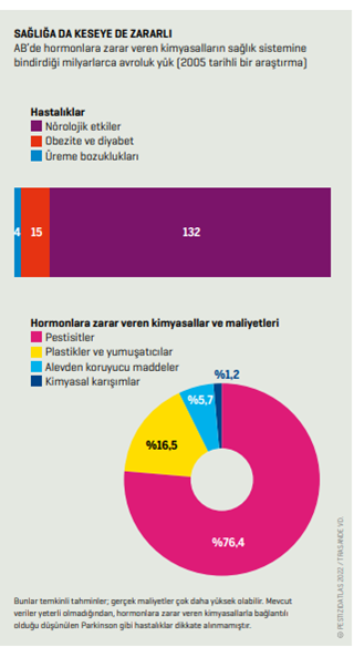 Atlas’ta pestisitler ayrıca karaciğer ve meme kanseri, tip 2 diyabet ve astım, alerji, obezite ve hormon bozuklukları açısından artan risk oranlarıyla da ilişkilendiriliyor. Doğum kusurları, erken doğum ve büyüme bozukluklarına da yol açabileceği belirtiliyor.
