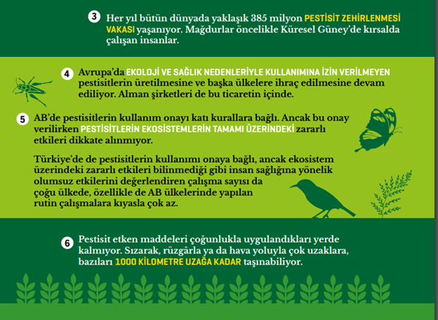 Pestisit Atlası’nda Avrupa Birliği’nin kullanımını yasakladığı pestisitlerin üretimine, bu zehirlerin dünyanın dört bir yanına ihraç edilmesine engel olmadığına dikkat çekiliyor.