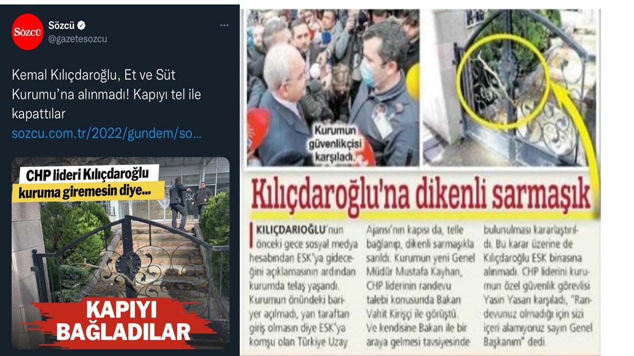 • Sözcü’nün, birçok sitenin alıntıladığı “CHP Genel Başkanı Kılıçdaroğlu’nun girişini engellemek için Et ve Süt Kurumu’nun kapısının telle bağlandığı” haberi yanlıştı; “yandan girmesin diye T. Uzay Ajansı’nın kapısının dikenli sarmaşıkla kapatıldığı” düzeltmesi de…