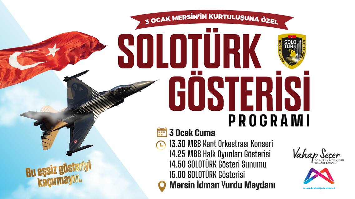 SOLOTÜRK Ekibi; 3 Ocak Cuma günü, Mersin İdman Yurdu Meydanı’nda Mersin’in kurtuluşuna özel gösteri yapacak. Program kapsamında önce 13.30’da MBB Kent Orkestrası konser verecek, ardından ise MBB Halk Oyunları Ekibi danslarıyla sahne alacak. Saat 14.50’de ise SOLOTÜRK’ün gösteri sunumunun ve gösterisi gerçekleştirilecek. Ekip, gökyüzünde gerçekleştireceği akrobasi ile Mersin’in kurtuluşunu unutulmaz bir gösteriyle taçlandıracak.